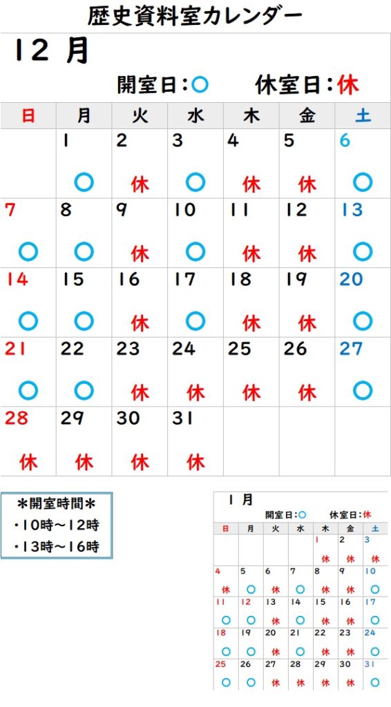 2025年12月の『歴史資料室 』開室日のお知らせです。※歴史資料館の開館日と異なります。