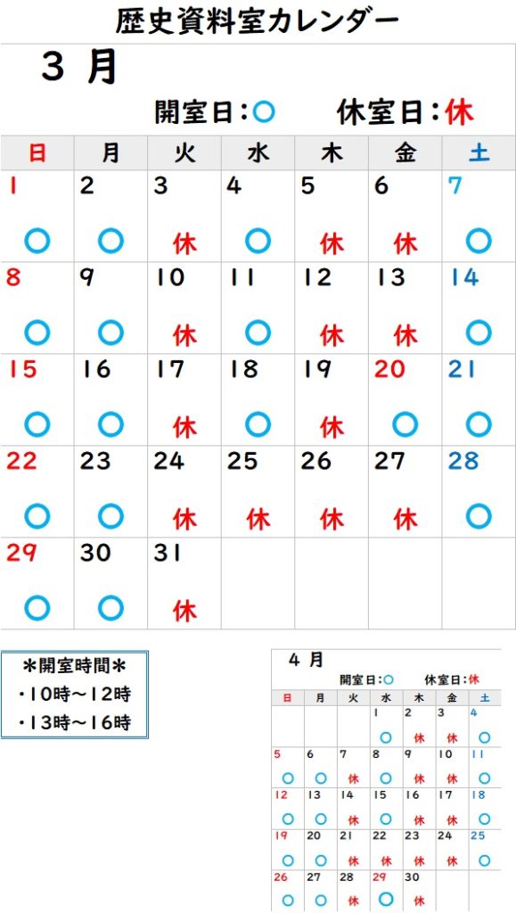 2026年3月の『歴史資料室 』開室日のお知らせです。※歴史資料館の開館日と異なります。